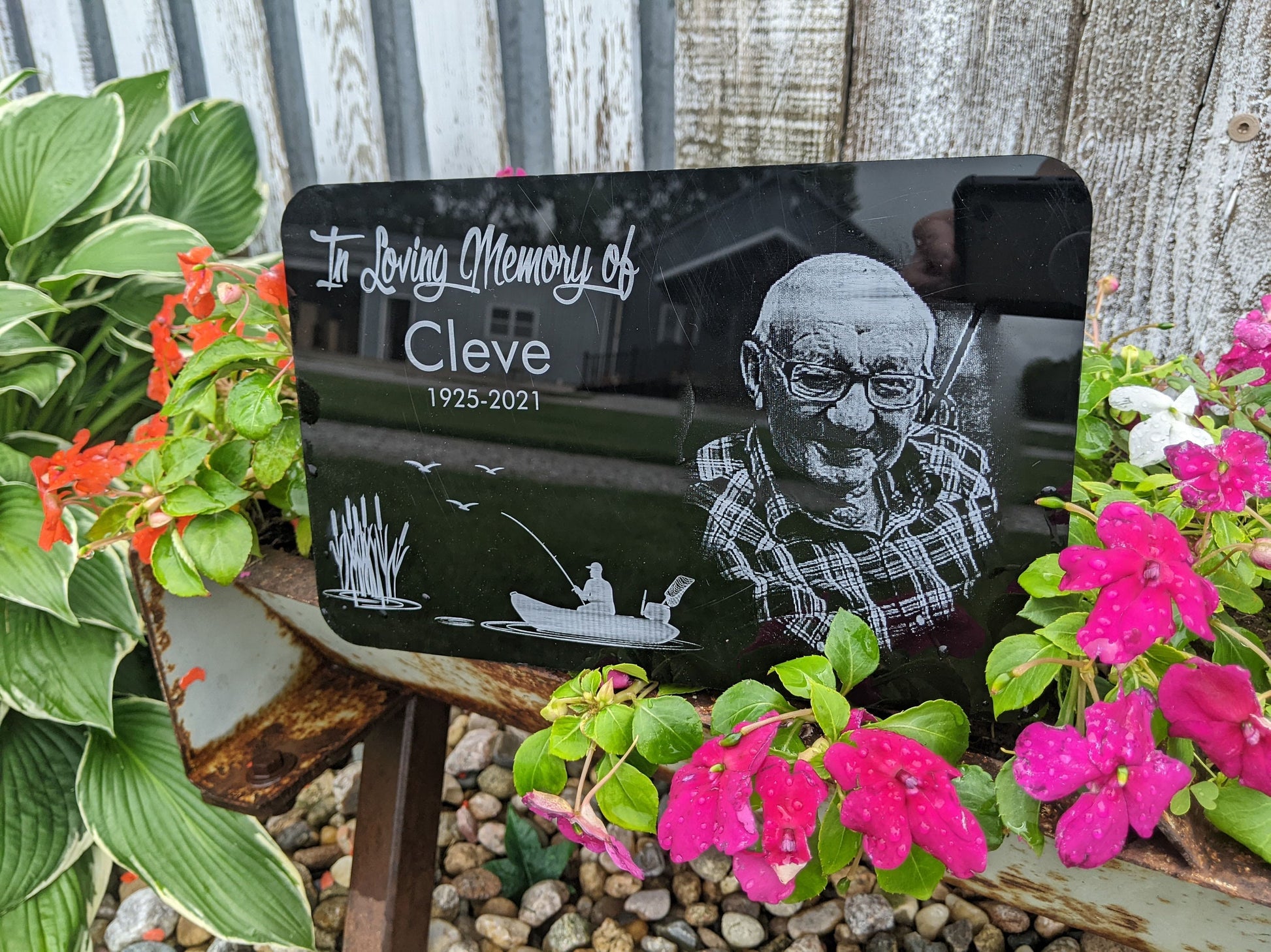 Submit a favorite photo to be etched onto the black acrylic. Add the name and dates in the top left corner.