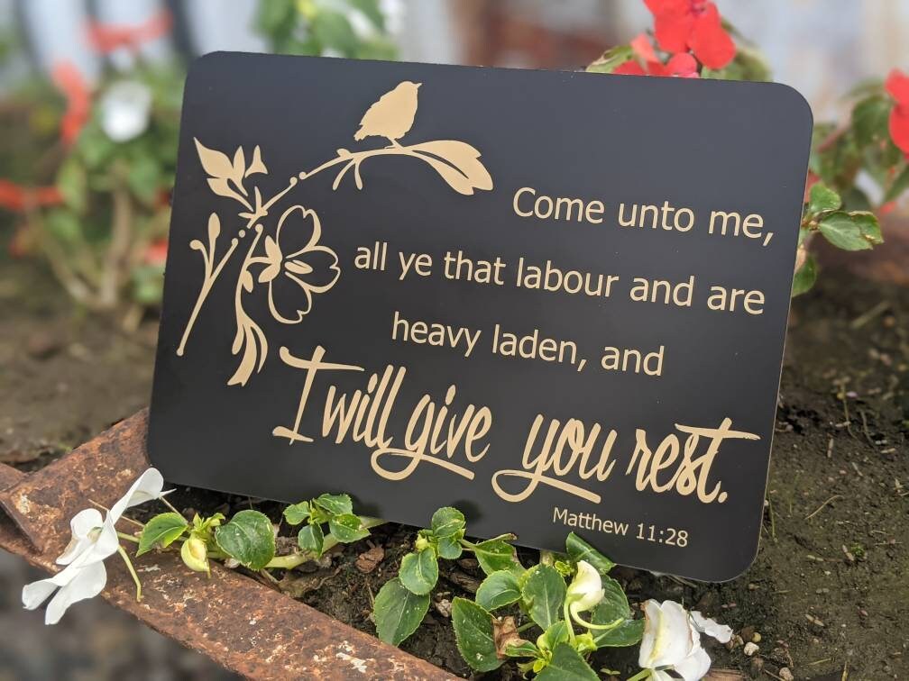This 1/8" thick black plate can easily be applied to any outdoor surface such as a garden bench.