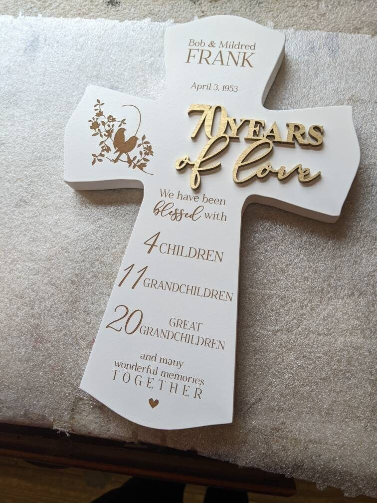 Honor the beautiful timeless love of 50 years (or any anniversary year) with this personalized engraved cross! The etching is a dark brown and shows up well against the white or wood brown cross. 50 Years of faith & love is overlaid - to create a 3D look making it extra special!