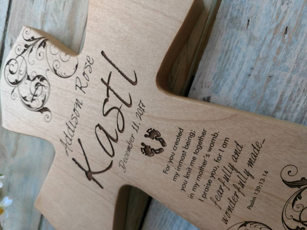 **Crosses are made with a compressed wood fiber plywood which we use due to it being a very stable and consistent product. They are painted white or sealed with a high quality finish. The etching shows up well with white cross or wood veneered cross.