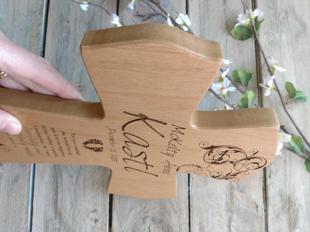 Etching is brown in color and will not fade or wash off, making this cross a wonderful keepsake