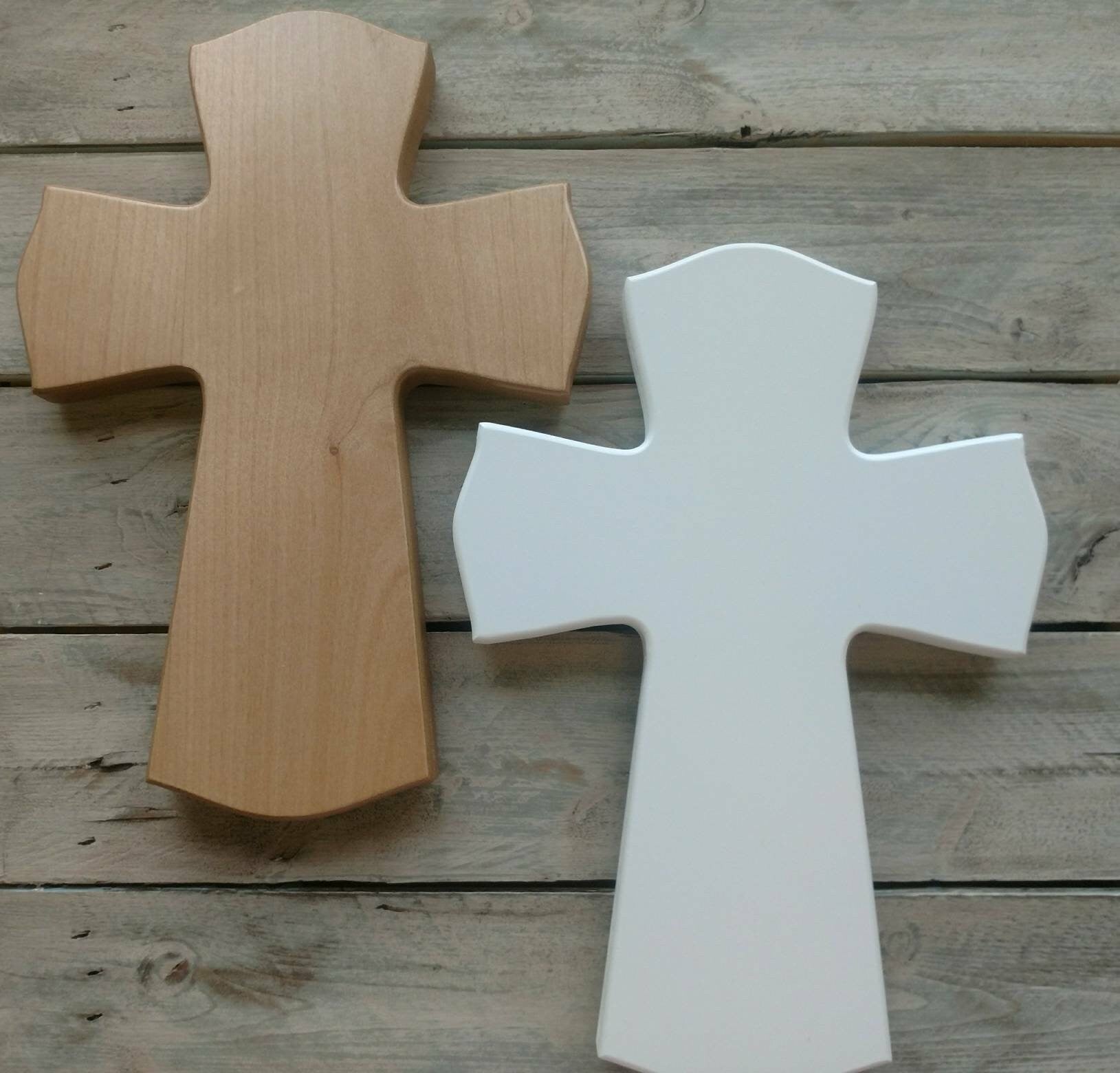 **Crosses are made with a compressed wood fiber plywood which we use due to it being a very stable and consistent product. They are painted white or sealed with a high quality finish. The etching shows up well with white cross or wood veneered cross.