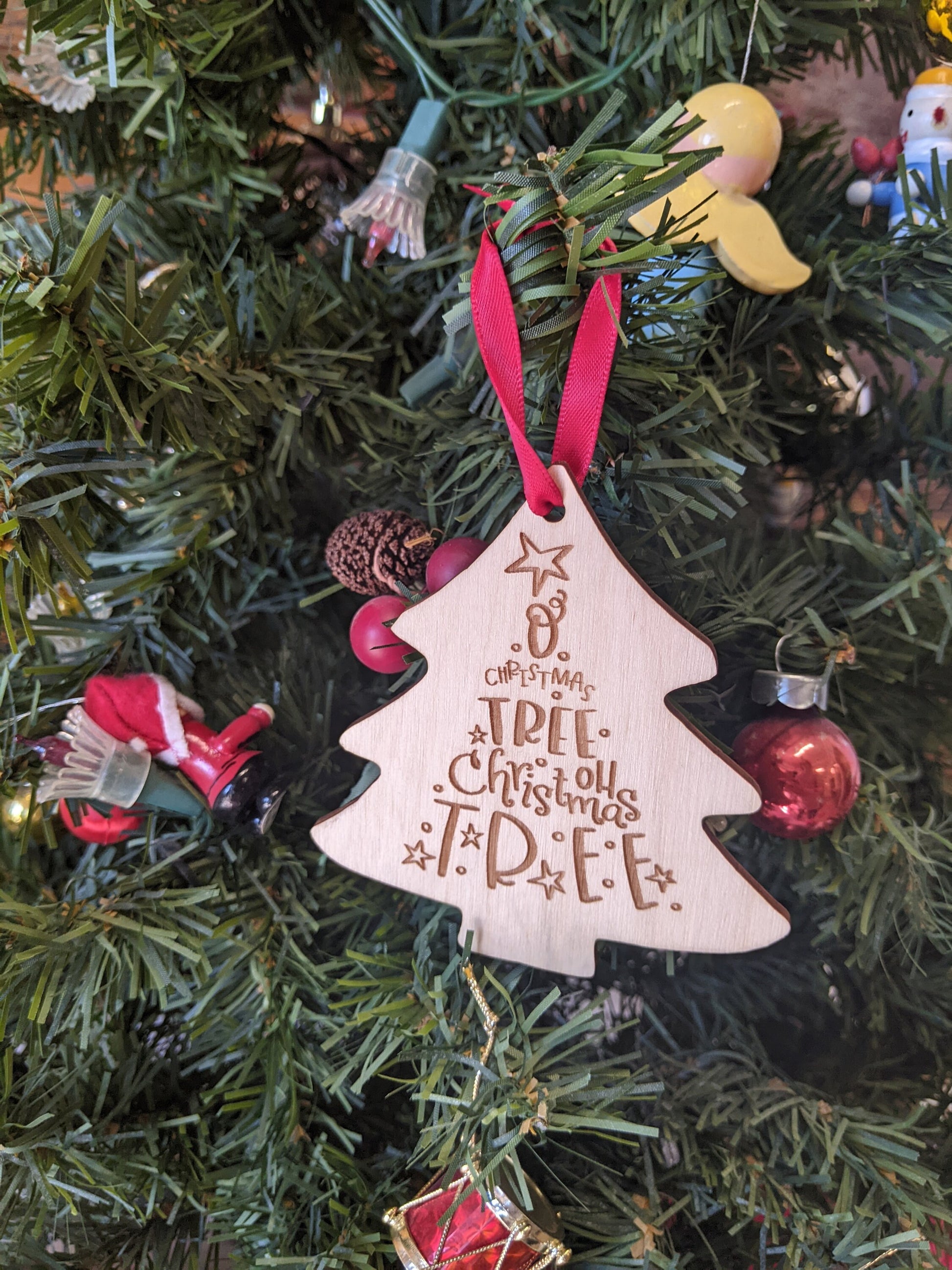 The detailed wood Christmas Tree ornament look beautiful with the twinkling Christmas light shinning behind them on the tree.